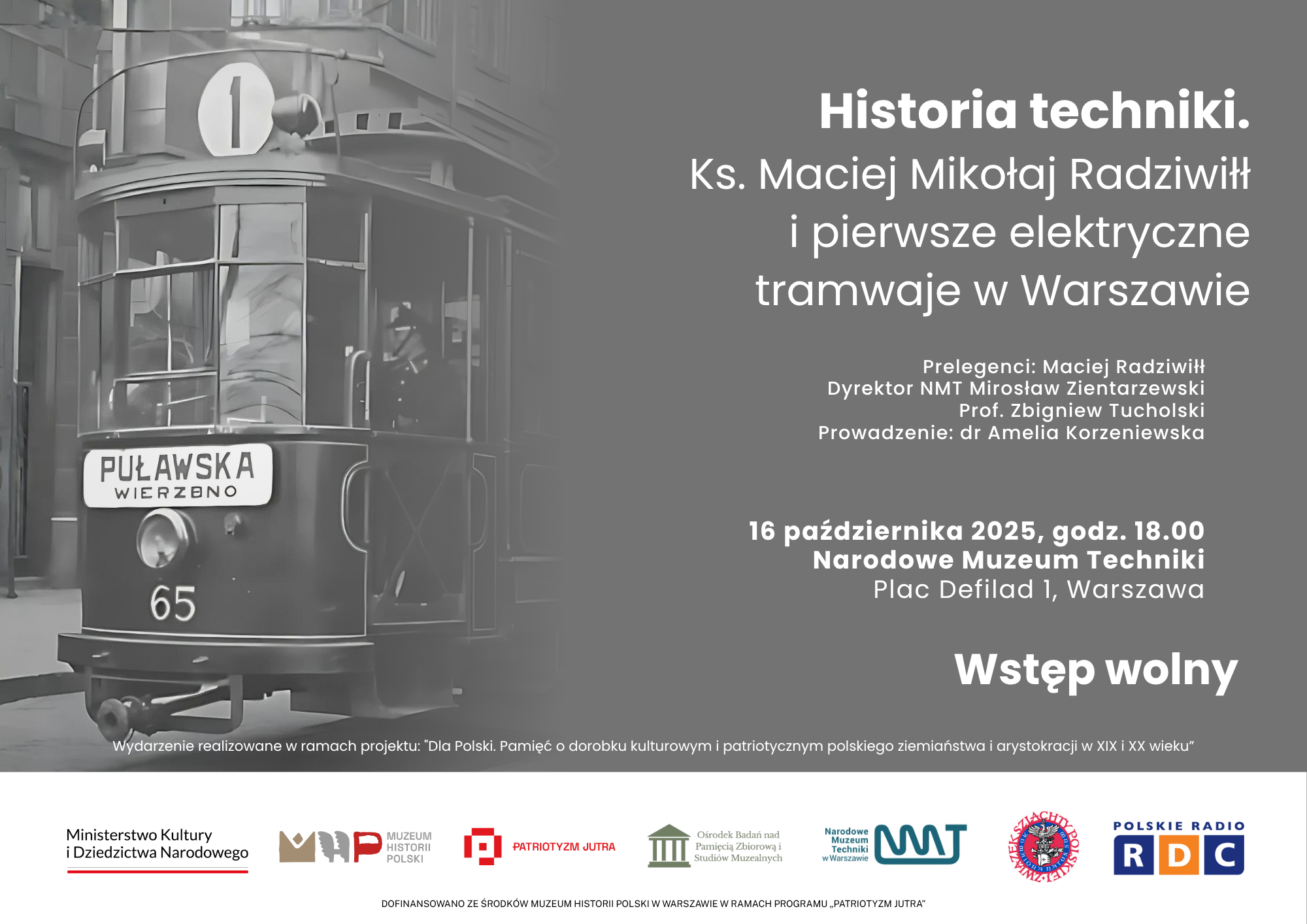 W najbliższy czwartek, 16 października o godzinie 18.00 w Narodowym Muzeum Techniki w Warszawie odbędzie się prelekcja pod tytułem „Historia techniki. Ks. Maciej Mikołaj Radziwiłł i pierwsze elektryczne tramwaje w Warszawie”. Wstęp wolny! Serdecznie zapraszamy.